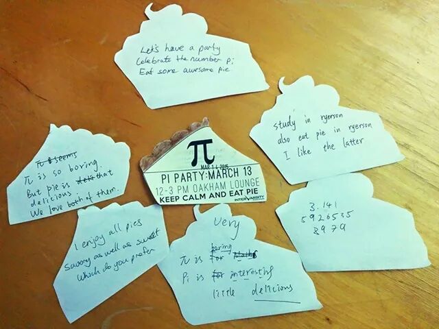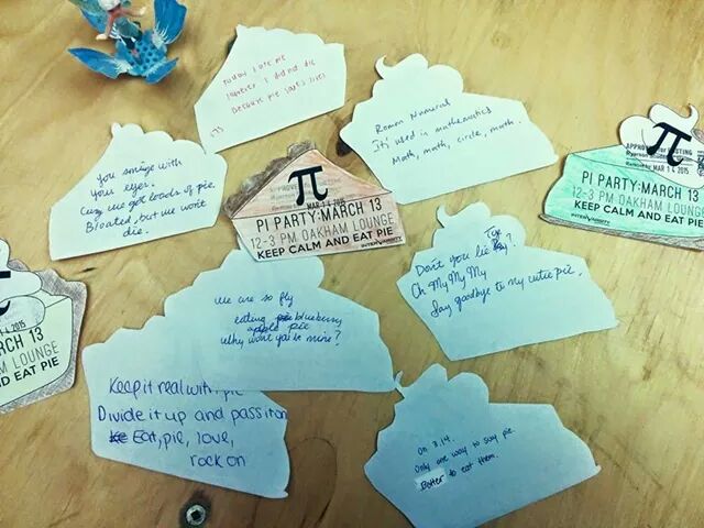 Last year I celebrated with pie and a private viewing of Life of Pi at my house, which ended up being a sleeper hit with a vast variety of students and fringe acquaintances attending. This year, I brought the party on campus, but we celebrated one day early (so we wouldn’t make the students come in on Saturday).